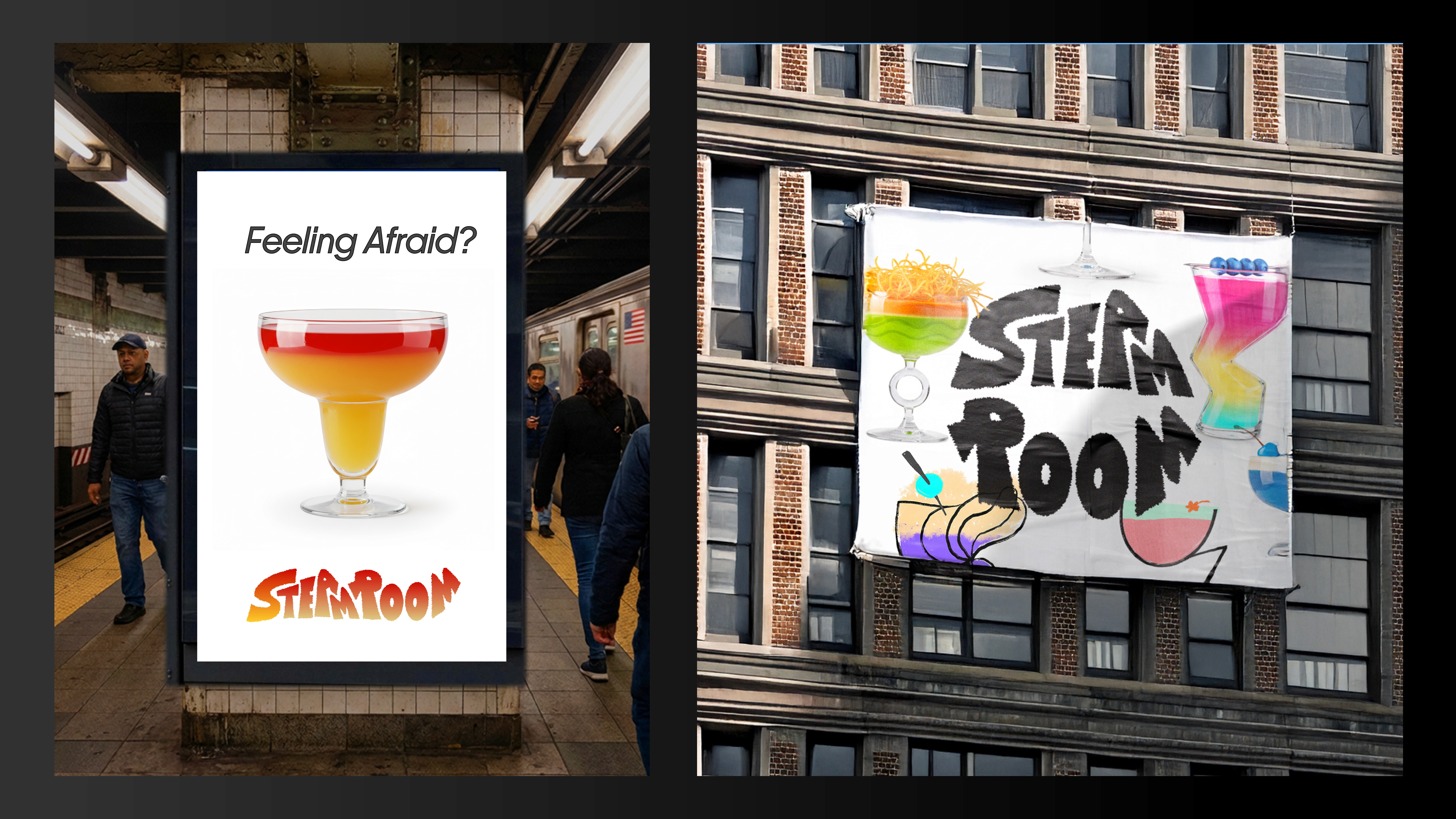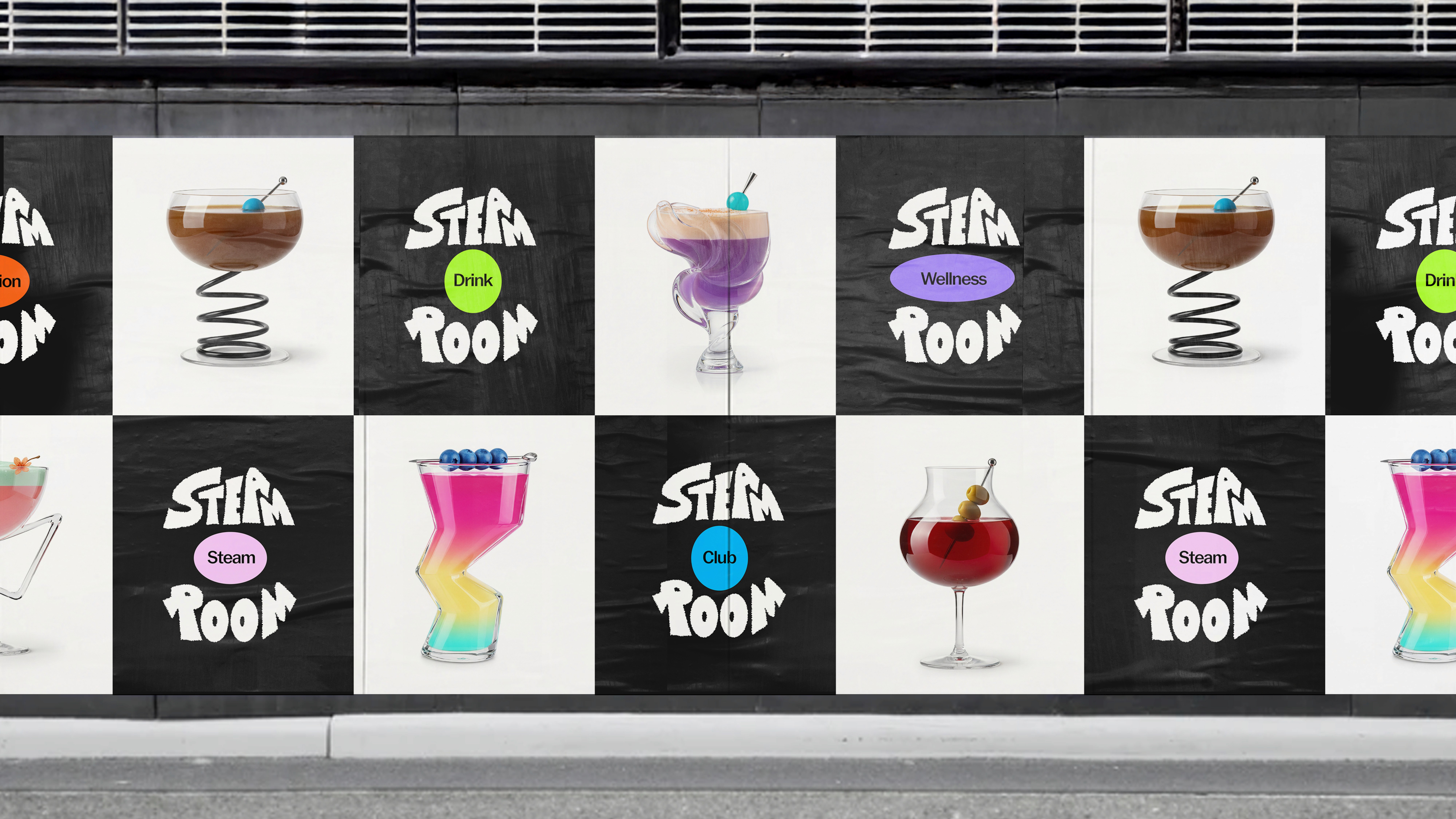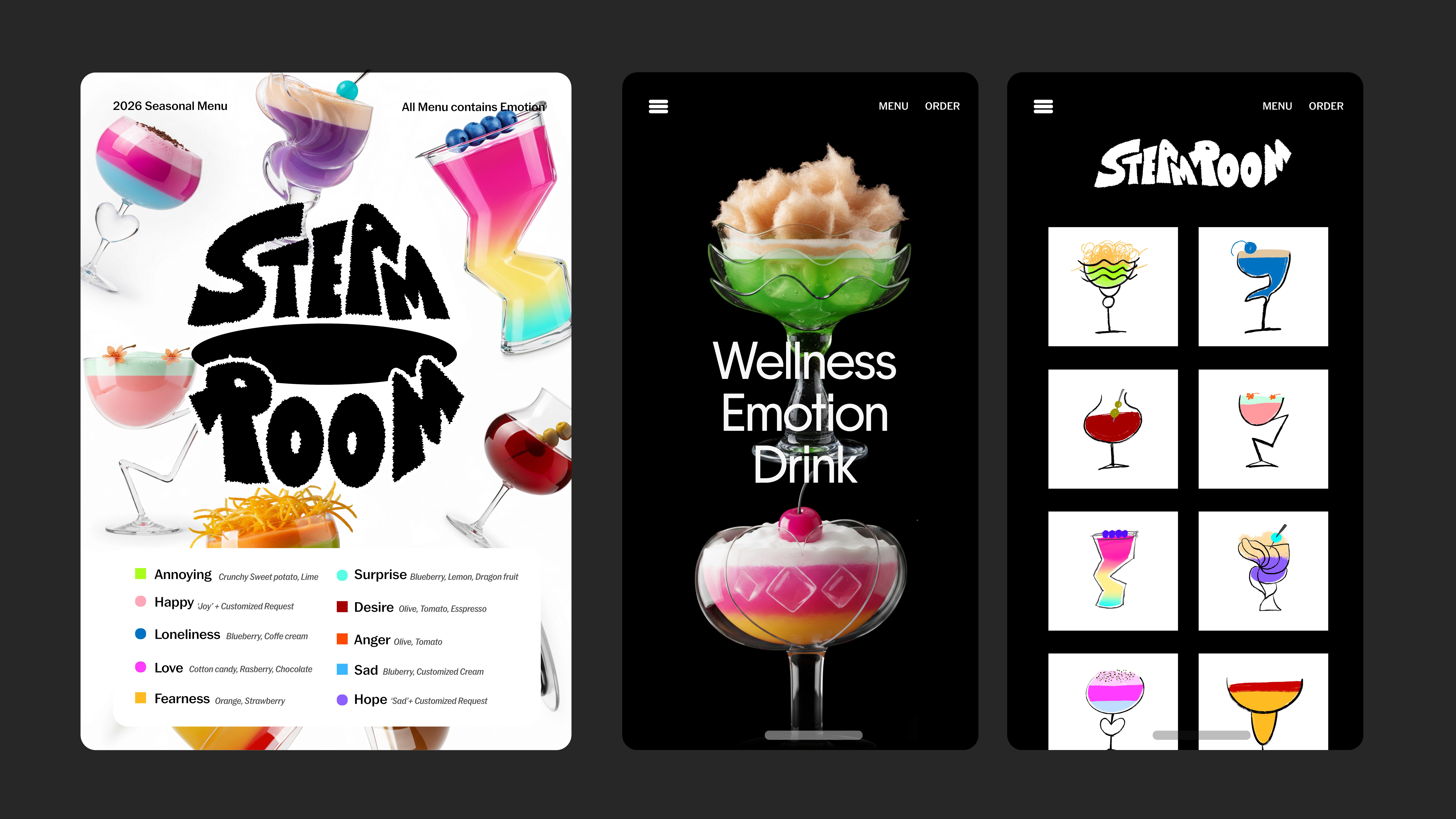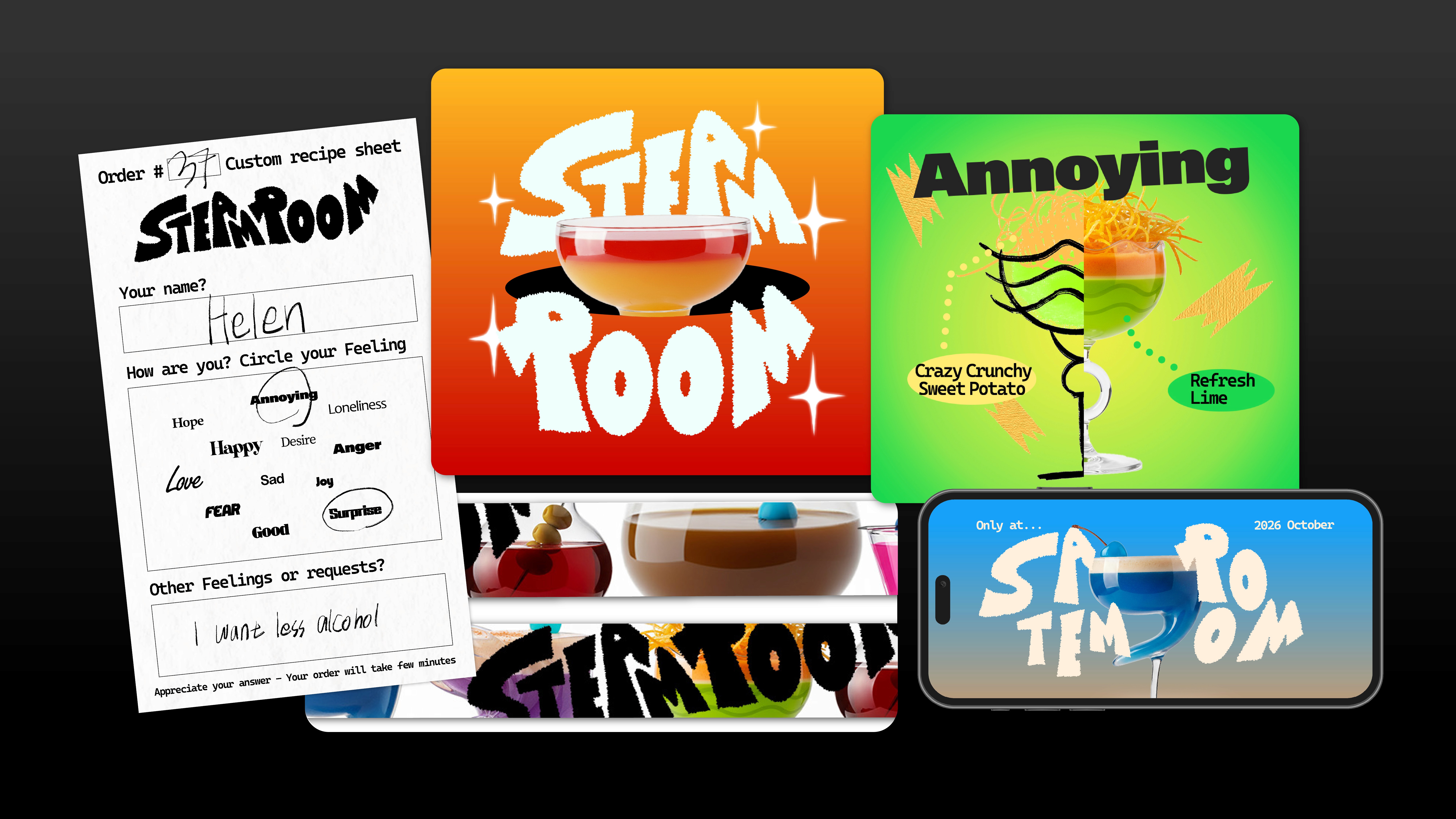 Steam Room is a fictional social wellness bar offering emotion-based cocktails. Inspired by the visual and flavor diversity of New York cocktails, the project explores how emotions can be expressed through cocktail forms, starting from hand-drawn illustrations and visualized using an AI image tool (NanoBanana).